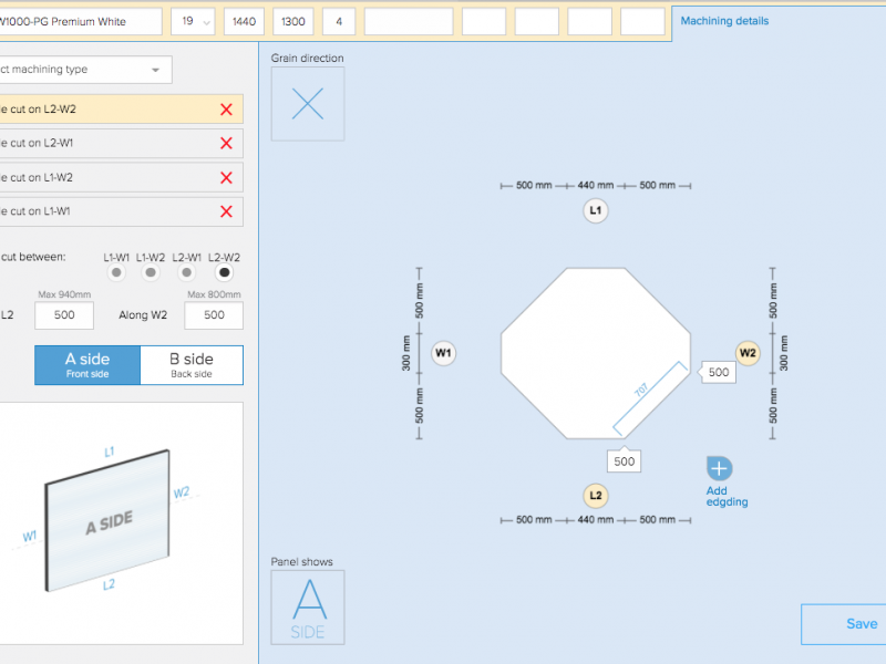 With a CNC machine, you no longer have to fiddle with protractors and scribbling equations on offcuts. You can now visualise and order your angle cuts through the Cworkshop website. The easy-to-use feature doesn’t rely on you calculating angles; measure the sides that require the angle. You can also select edging with this feature.